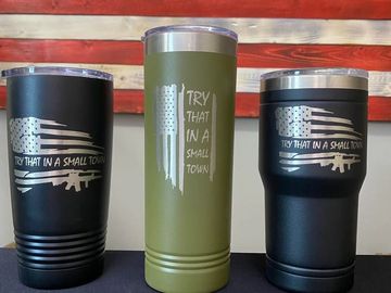 The Black "Try That In a Small Town" are 20oz. The Green "Try that In a Small Town" are 22oz. We have 19 color options to choose from.